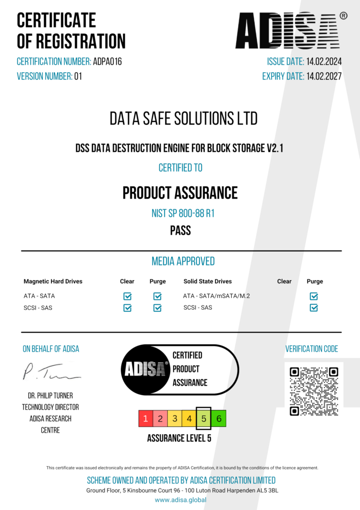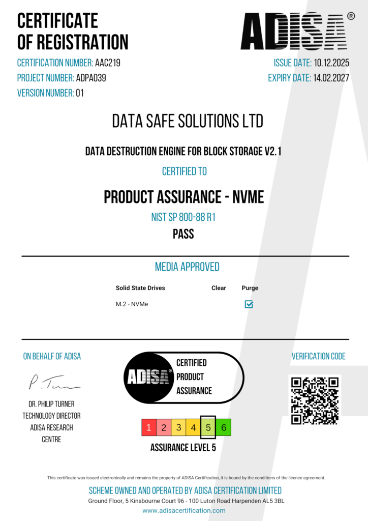 Our position is independently validated through ADISA Product Assurance at Level 5, with explicit scope across modern storage media, including NVMe.