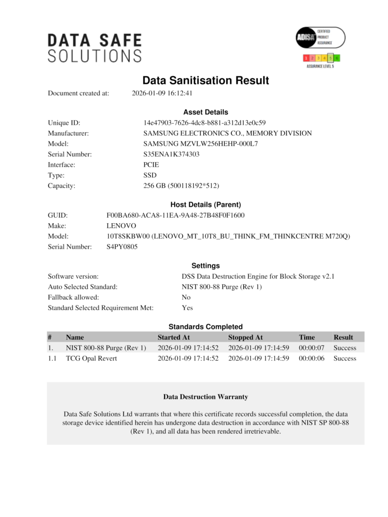 Where a Data Safe Solutions Certificate of Data Destruction records successful completion, we warrant that the data on the identified device has been rendered irretrievable in accordance with NIST SP 800‑88 Rev 1.